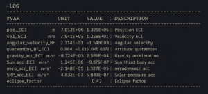 The External Log panel allows users to export selected spacecraft state variables to a human-readable ASCII file, organized by columns.